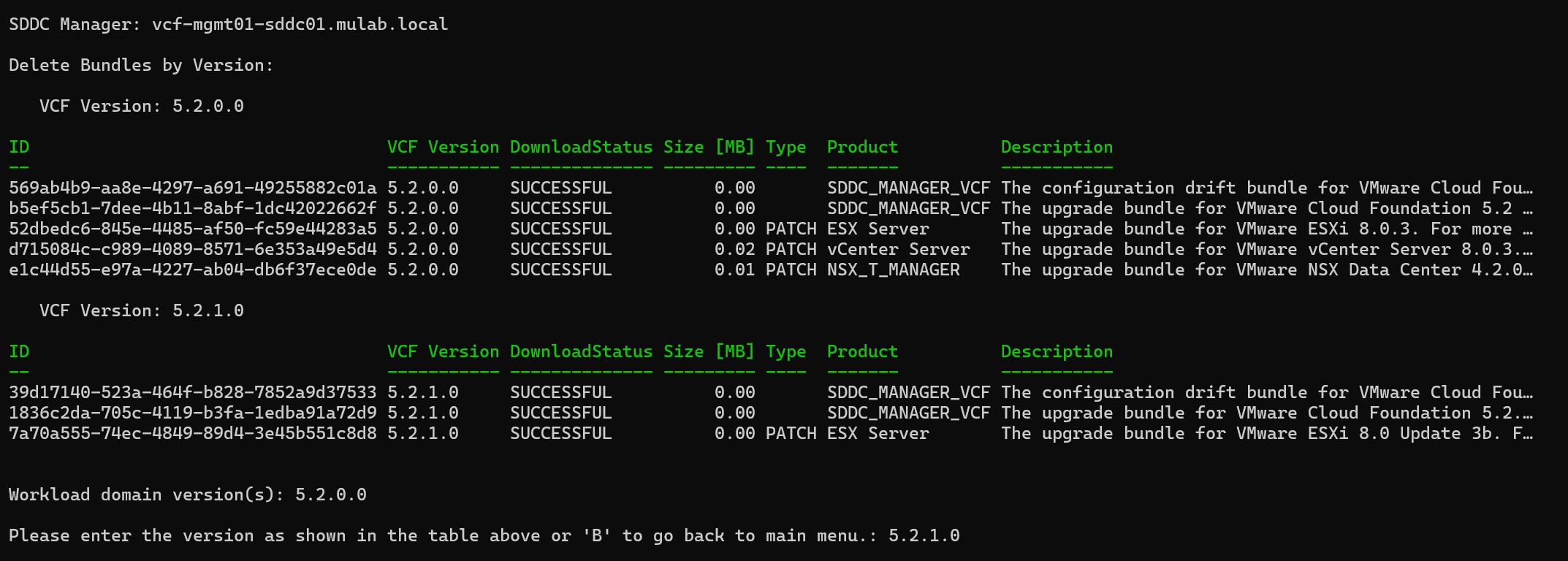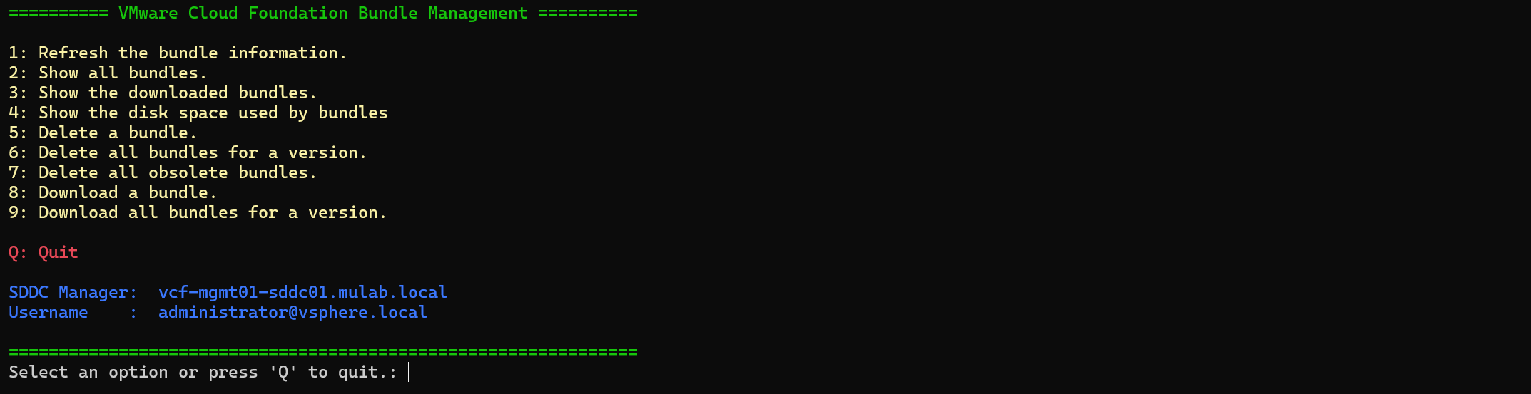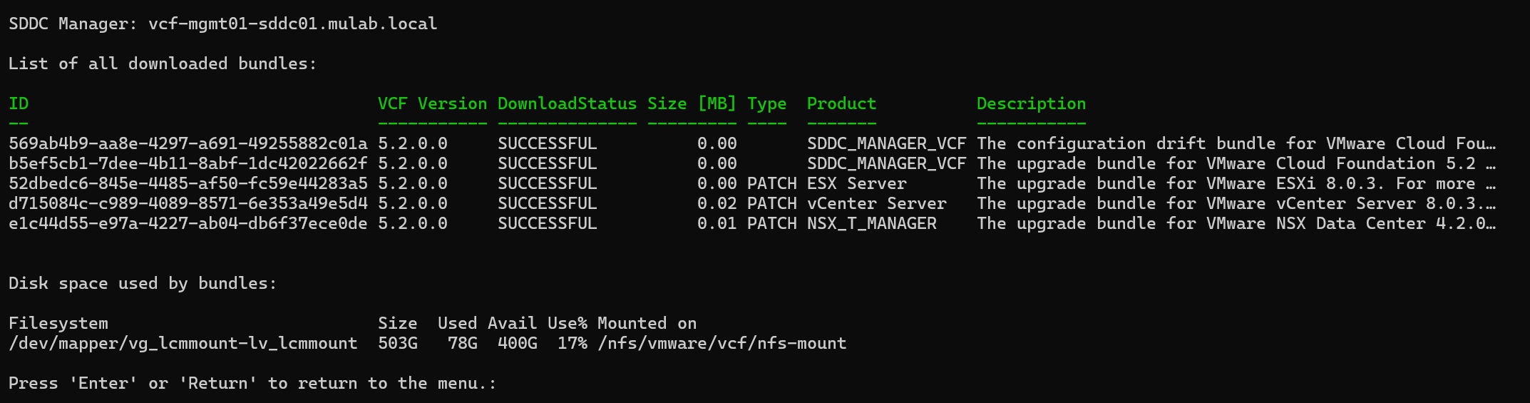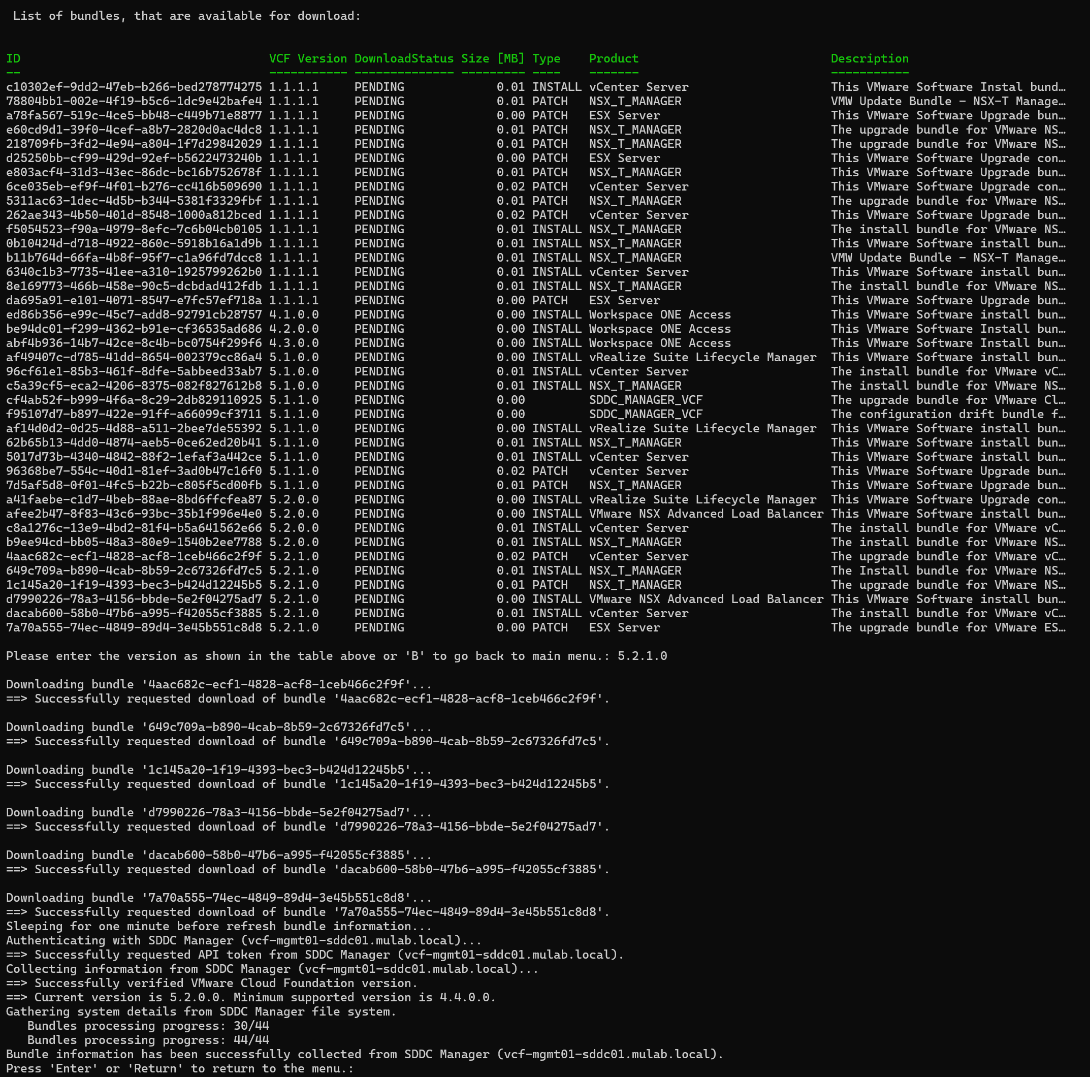 .\VcfBundleManagement.ps1 -server <SDDC_Manager_FQDN> -user <SDDC_Manager_SSO_User> -pass <SDDC_Manager_SSO_Password> -rootPass <SDDC_Manager_Root_Password>