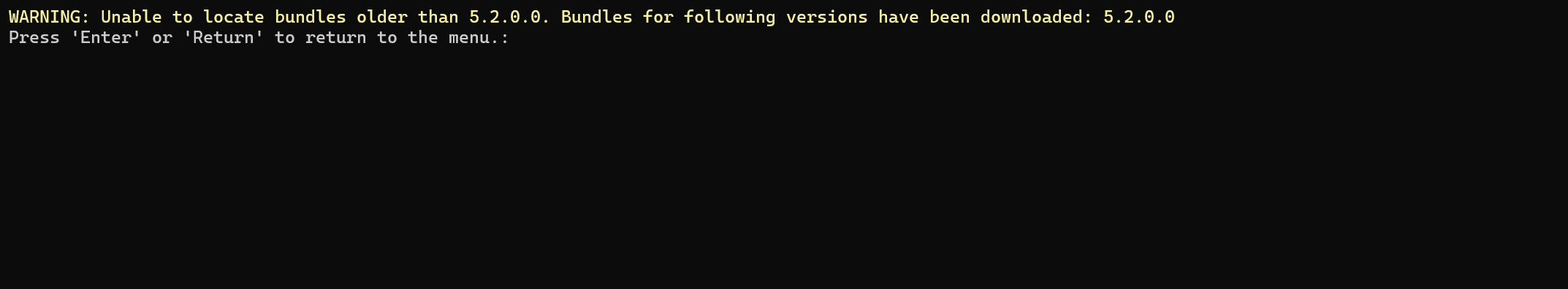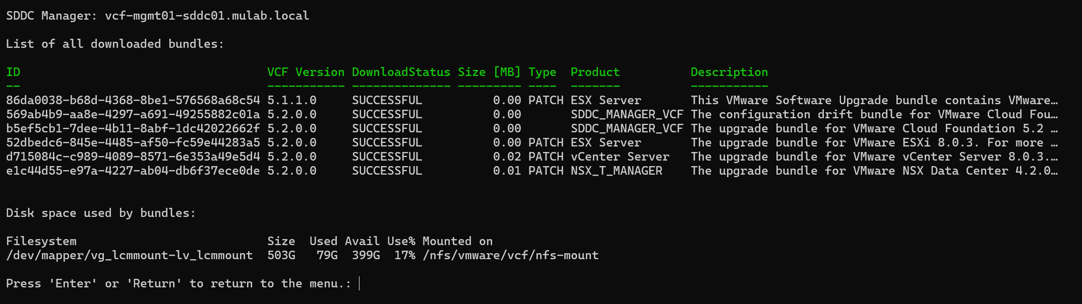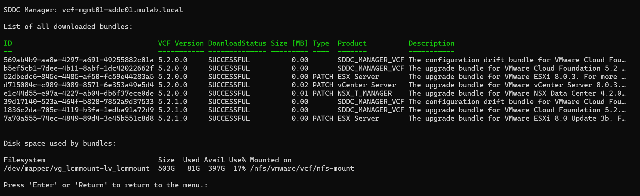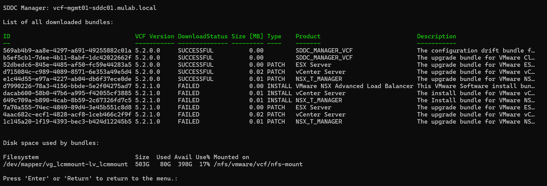 .\VcfBundleManagement.ps1 -server <SDDC_Manager_FQDN> -user <SDDC_Manager_SSO_User> -pass <SDDC_Manager_SSO_Password> -rootPass <SDDC_Manager_Root_Password>