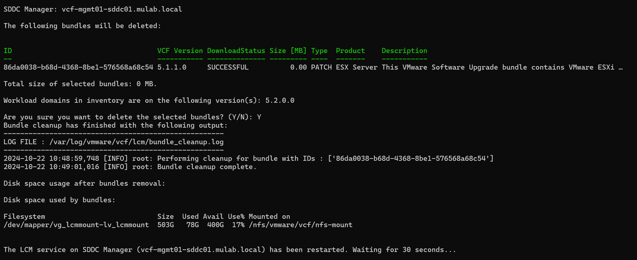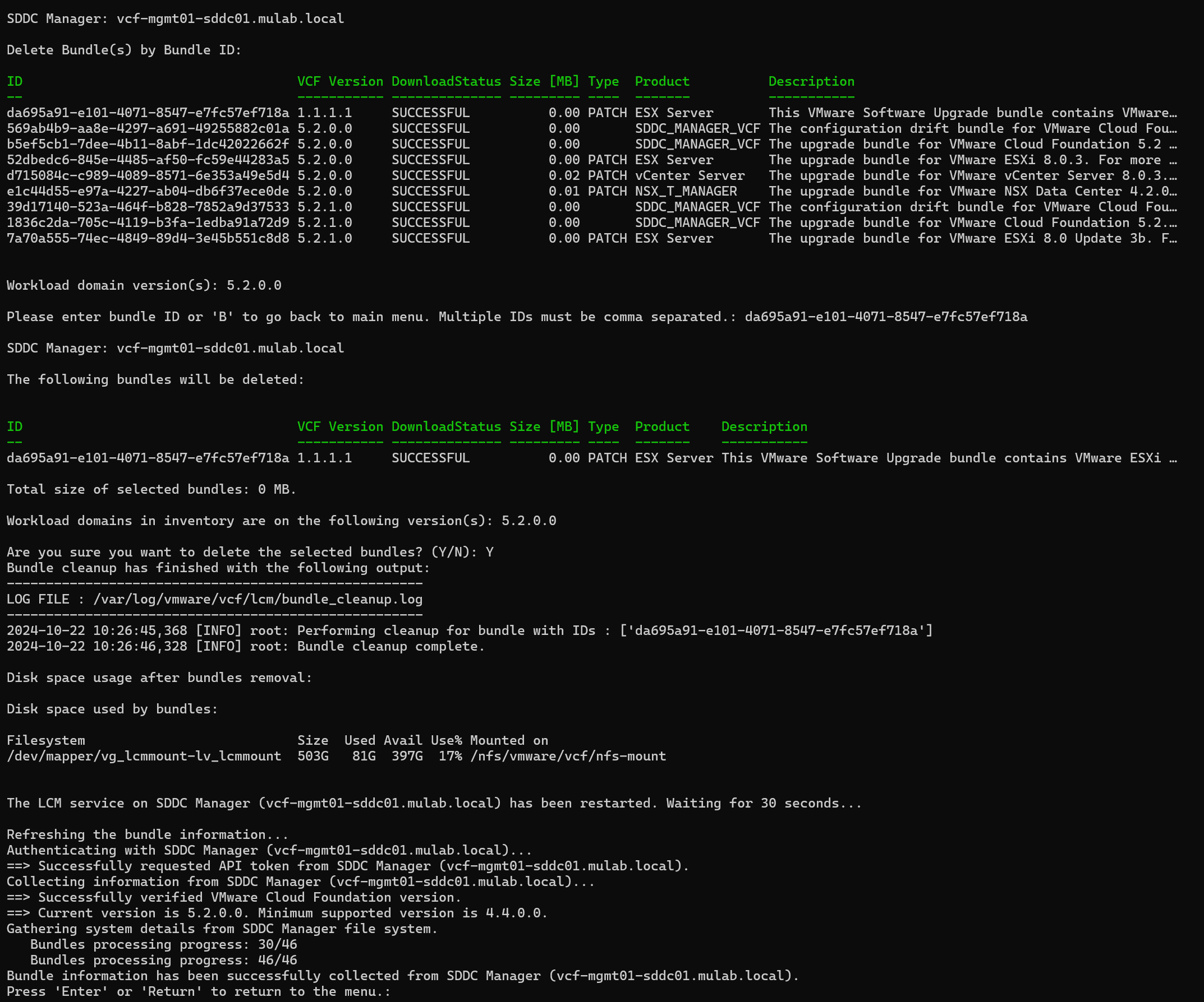 输入数字“7”并回车,用于删除 SDDC Manager 中所有已过时的软件包。当前工作负载域版本是 5.2.0.0,所以 5.1.1.0 版本相对来说是过时软件包。