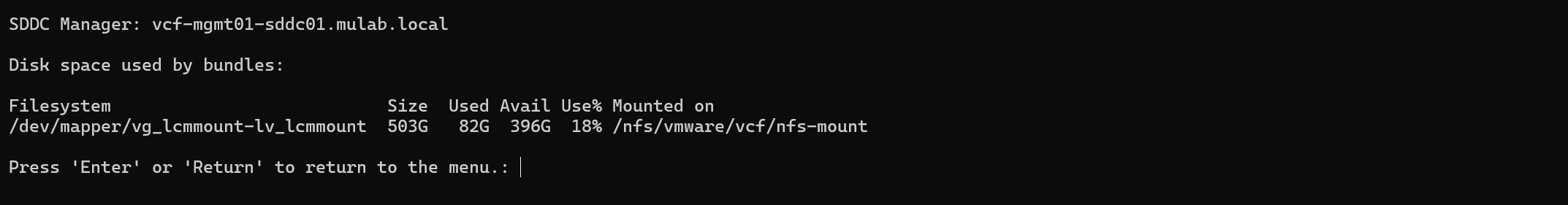 输入数字“4”并回车,用于查看 SDDC Manager 中软件包存放目录的磁盘空间使用情况。注,可以按“回车”回到选项菜单。