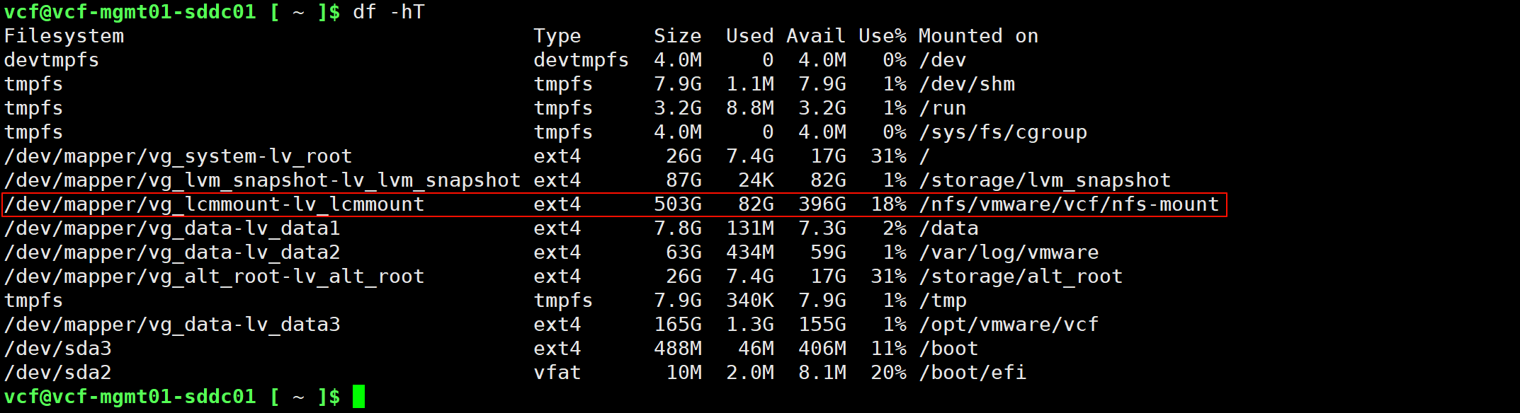 默认情况下,SDDC Manager 所下载的软件包会存放到虚拟机的 /nfs/vmware/vcf/nfs-mount 目录,如下图所示。这个目录的空间是有限的,随着下载的软件包越来越多,可用空间会越来越少直至被完全占满,因此,我们需要对这些软件包进行管理。