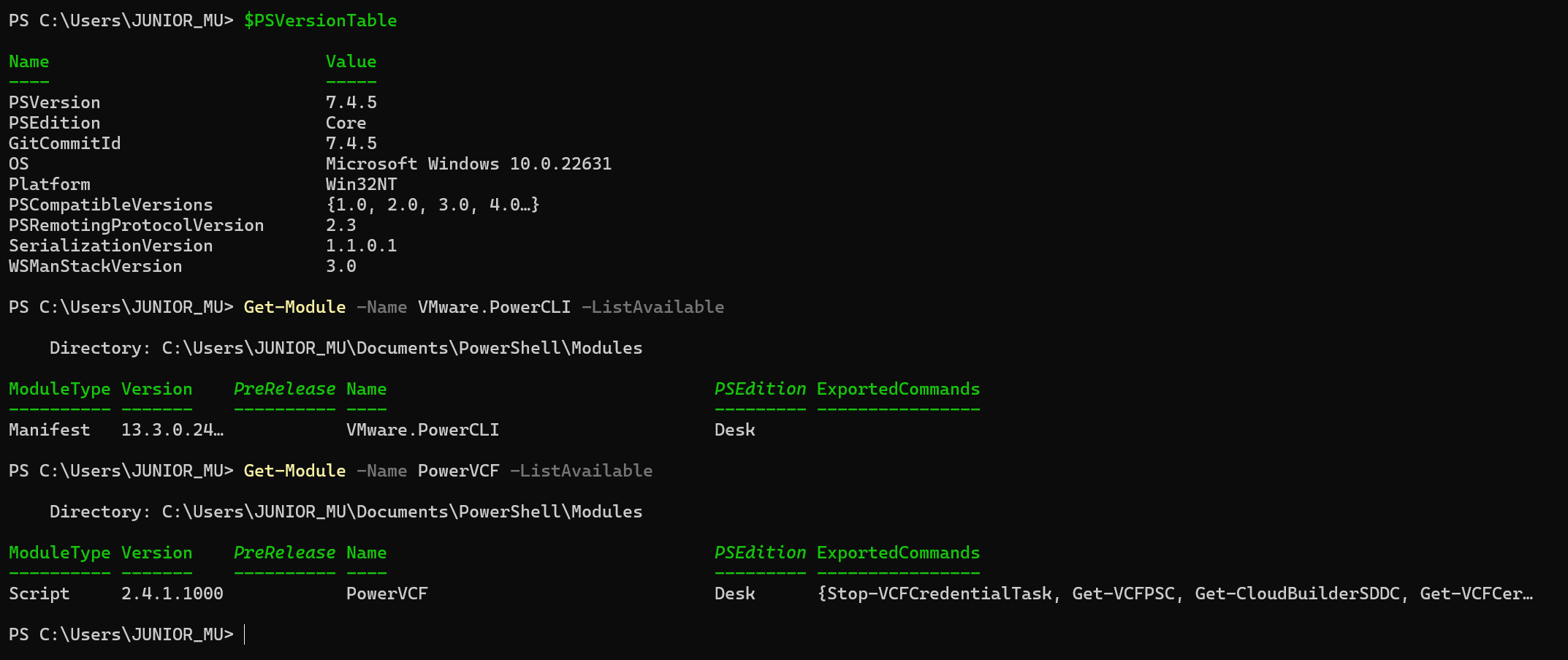 使用这个 PowerShell 脚本需要安装一些运行环境,因为脚本所执行的相关操作需要调用这些环境中的命令或 API 才能完成,具体如下。可以参考这篇(使用 PowerVCF 连接和管理 VMware Cloud Foundation 环境。)文章中方法准备这些环境。