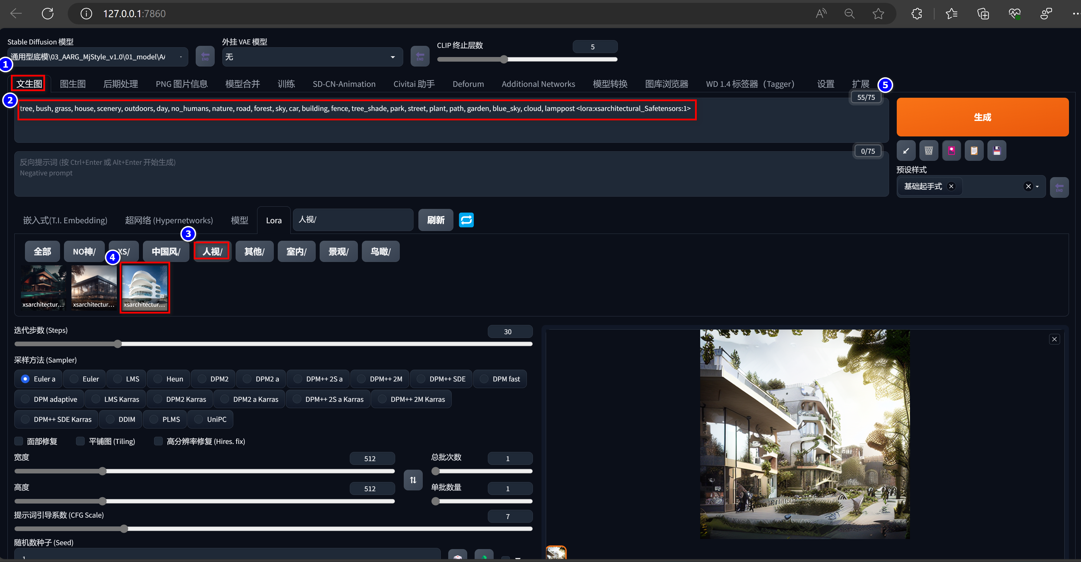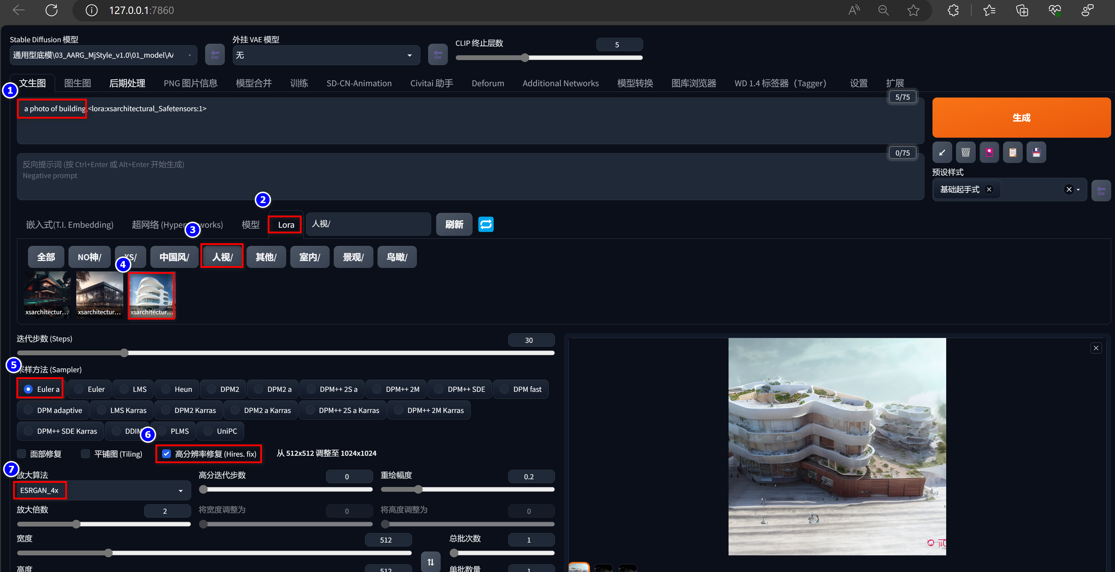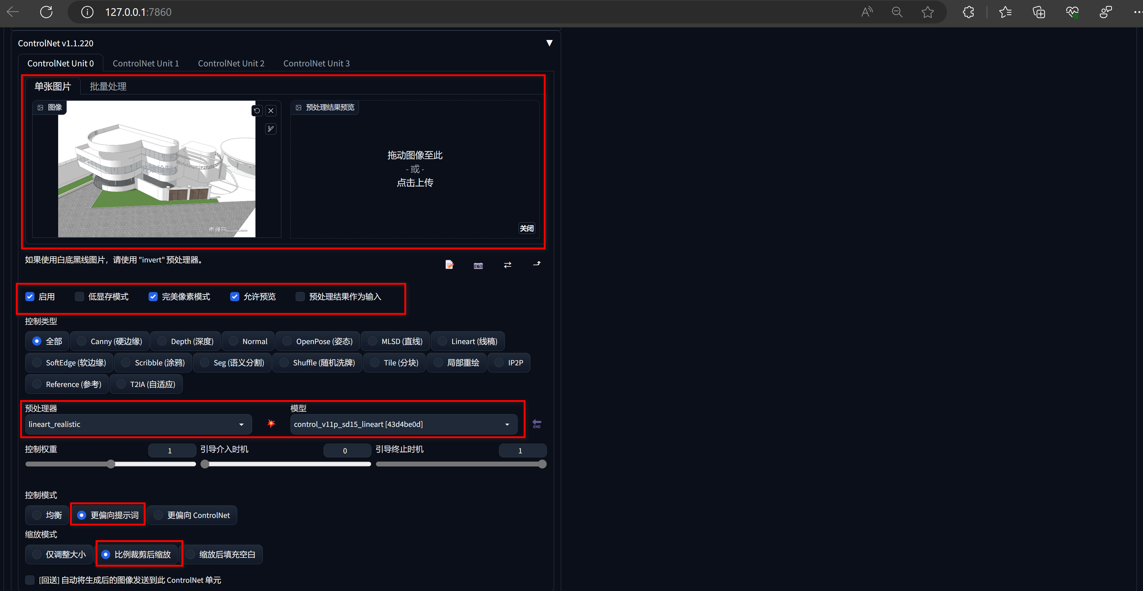 预处理器: 建筑设计 Lineart(线稿分析)/Seg(语义分析)/Depth(图片深度分析)/Mlsd(直线线条检测)