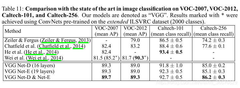 在前面几节中,我们讨论了在ILSVRC数据集上对非常深的ConvNets进行训练和评估。在本节中,我们将在ILSVRC上预训练的ConvNets评估为在其他更小的数据集上的特征提取器,由于过度拟合,从零开始训练大型模型是不可行的。最近,人们对这种用例有很多兴趣,结果表明,在ILSVRC上学习的深层图像表示,可以很好地推广到其他数据集,在这些数据集上,它们的表现远远好于手工制作的表示。遵循这一工作路线,我们调查我们的模型是否比现有方法中使用的浅层模型具有更好的性能。在此评估中,我们考虑了在ILSVRC(第4节)上具有最佳分类性能的两个模型——配置“Net-D”和“Net-E”(我们将其公开提供)。
