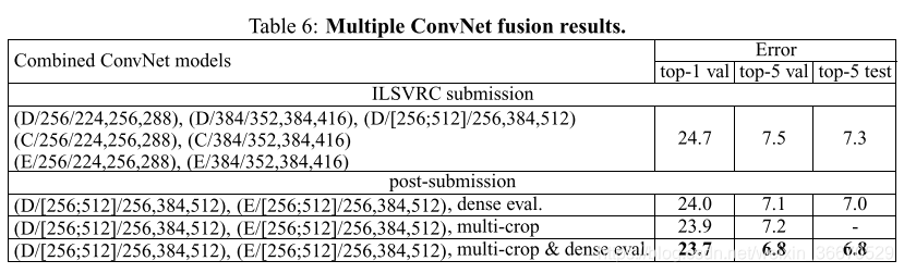 到ILSVRC提交时,我们只训练了单尺度网络和多尺度模型D(通过只微调全连接层而不是所有层)。得到的7个网络的合集有7.3%的ILSVRC测试误差。提交后,我们只考虑了两个性能最好的多尺度模型(配置D和E)的集成,使用密集评价将测试误差降低到7.0%,使用密集和多作物联合评价将测试误差降低到6.8%。作为参考,我们性能最好的单个模型的误差达到了7.1%(模型E,表5)。