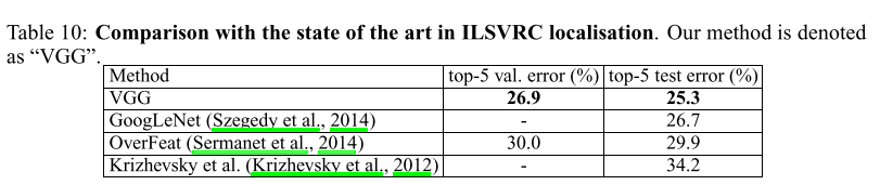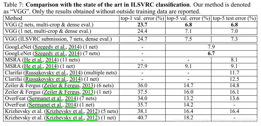 从表7可以看出,我们的very deep ConvNets明显优于上一代模型,在ILSVRC-2012和ILSVRC-2013比赛中取得了最好的成绩。我们的结果与分类任务赢家(GoogLeNet有6.7%的错误)相比也是有竞争力的,并且大大超过了ILSVRC-2013获胜提交的Clarifai,后者在有外部训练数据的情况下达到了11.2%,在没有训练数据的情况下达到了11.7%。这是值得注意的,考虑到我们的最佳结果是通过结合只有两个模型-大大低于使用在大多数ILSVRC提交。在单网性能方面,我们的架构达到了最好的结果(7.0%的测试错误),比单一的GoogLeNet好0.9%。值得注意的是,我们并没有背离LeCun等人的经典ConvNet架构,而是通过大幅增加深度来改进它。