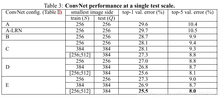 )上训练效果要好得多,即使在测试时使用单一尺度。这证实了通过尺度抖动增强训练集确实有助于捕获多尺度图像统计。