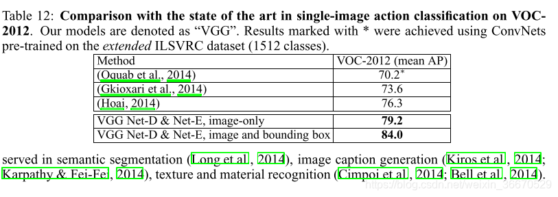 我们还在PASCAL VOC 2012动作分类任务中评估了我们的最佳表现图像表示(Net-D和Net-E特征的叠加),该任务包括从单个图像中预测一个动作类,给出一个执行该动作的人的边界框。数据集包含4.6K的训练图像,分为11个类。与VOC 2012目标分类任务类似,使用mAP测量性能。我们考虑了两种训练设置:(i)、计算整个图像上的ConvNet特性,并忽略提供的边界框;(ii)计算整幅图像和所提供的边界框上的特征,并将其叠加得到最终的表示。结果与表12中的其他方法进行了比较。