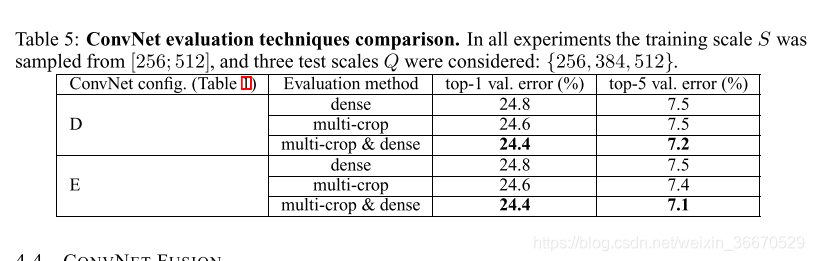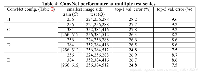 结果如表4所示,表明规模抖动测试时候会导致更好的性能(相对于评估相同的模型在一个单一的规模,表3所示),和之前一样,最深的配置(D和E)表现最好的,和规模抖动比训练一个固定的最小边美国最好单独的网络性能验证组排名前24.8% / 7.5% /五大错误(以粗体突出显示在表4)。在测试集,配置E达到7.3%的前5位误差。