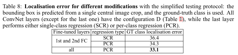为了执行目标定位,我们使用了一个非常深的卷积网络,其中最后一个完全连接的层预测边界框位置,而不是类得分。包围框由存储其中心坐标、宽度和高度的4-D向量表示。可以选择是所有类共享边界框预测,还是特定于类(每类回归,PCR)。在前一种情况下,最后一层是4-D,而在后一层是4000-D(因为数据集中有1000个类)。除了最后一个边界框预测层之外,我们使用了ConvNet架构D(表1),它包含16个权重层,在分类任务(第4节)中表现最好。