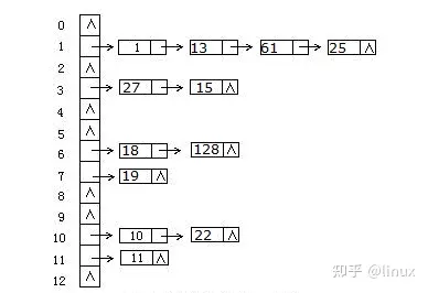 unordered_set是基于哈希表,因此要了解unordered_set,就必须了解哈希表的机制。哈希表是根据关键码值而进行直接访问的数据结构,通过相应的哈希函数(也称散列函数)处理关键字得到相应的关键码值,关键码值对应着一个特定位置,用该位置来存取相应的信息,这样就能以较快的速度获取关键字的信息。比如:现有公司员工的个人信息(包括年龄),需要查询某个年龄的员工个数。由于人的年龄范围大约在[0,200],所以可以开一个200大小的数组,然后通过哈希函数得到key对应的key-value,这样就能完成统计某个年龄的员工个数。而在这个例子中,也存在这样一个问题,两个员工的年龄相同,但其他信息(如:名字、身份证)不同,通过前面说的哈希函数,会发现其都位于数组的相同位置,这里,就涉及到“冲突”。准确来说,冲突是不可避免的,而解决冲突的方法常见的有:开发地址法、再散列法、链地址法(也称拉链法)。而unordered_set内部解决冲突采用的是----链地址法,当用冲突发生时把具有同一关键码的数据组成一个链表。下图展示了链地址法的使用: