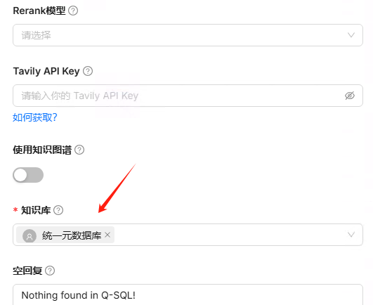 在 “Q->SQL” 组件中,选择对应的统一元数据库知识库,以便 Agent 能够参考其中的自然语言问题与 SQL 语句示例对,提高生成 SQL 语句的准确性。