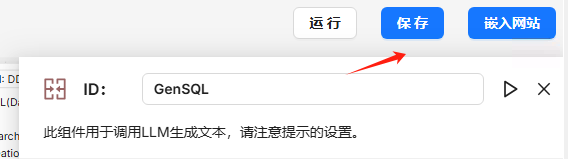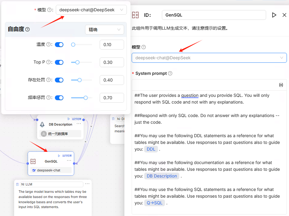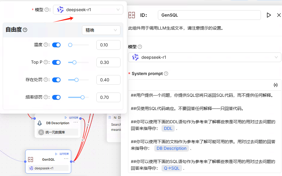 对于 “GenSQL” 组件,它负责根据用户的自然语言问题和从知识库中检索到的信息,生成 SQL 语句。这里可以根据实际需求调整一些参数,比如生成 温度、Top P等。