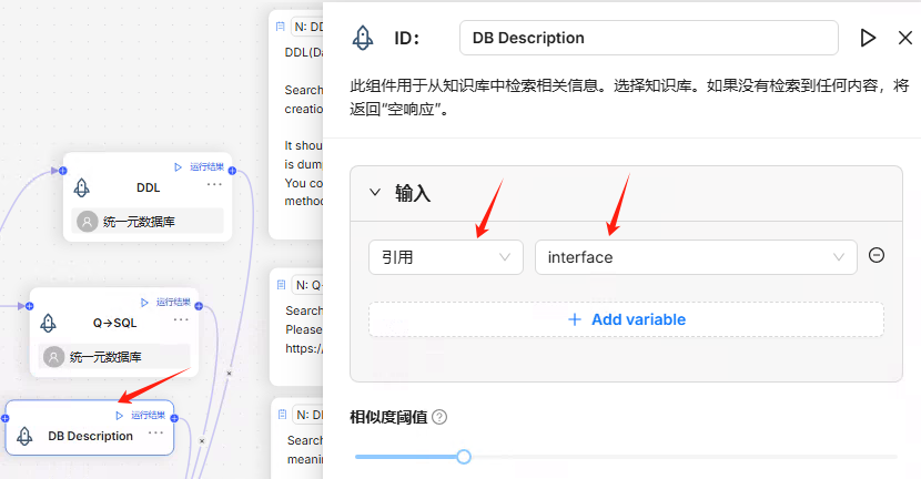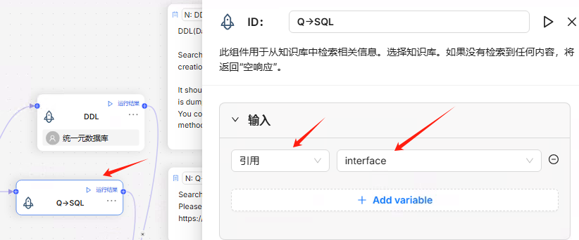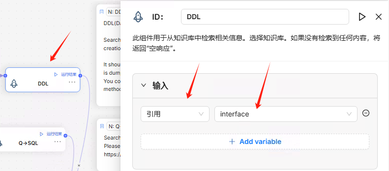 然后,对各个组件进行详细配置。在 “DDL” 组件中,选择之前创建的统一元数据库知识库,这样 Agent 在生成 SQL 语句时,就可以从该知识库中获取数据库的表结构信息。