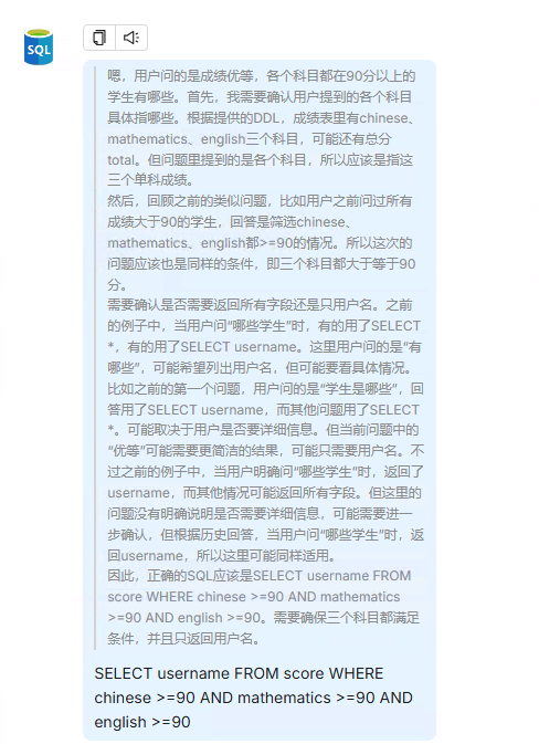 通过这样的 DDL 语句,我们可以清晰地了解到成绩表表包含用户 ID、用户姓名、各科成绩等字段。获取 DDL 知识库数据可以通过数据库管理工具导出数据库的表结构定义,或者直接从数据库的系统表中查询相关信息。