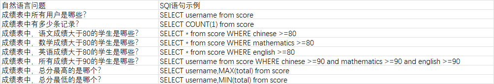###成绩表(scroe)这个表描述了学生成绩,主要包含学生的语文,数学,英语成绩。详细的字段包含如下字段: id:id,表示用户的唯一性记录。 username:用户姓名,表示学生的用户姓名 chinese:语文,表示学生的语文成绩 mathematics:数学,表示学生的数学成绩 english:英语,表示学生的英语成绩 total:总分,表示学生的总成绩