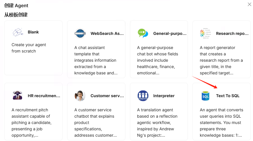 在 RAGflow 界面中,找到 “Agent” 选项,点击 “Create agent”,然后选择 “Text To SQL” 。
