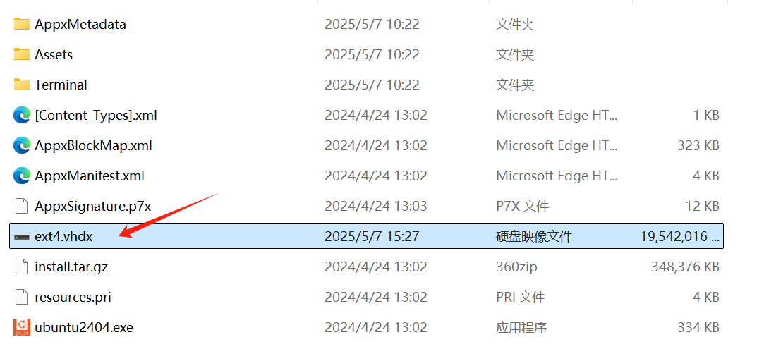 进入本地目录,D:\Ubuntu_2404.0.5.0_x64,可以看到文件ext4.vhdx