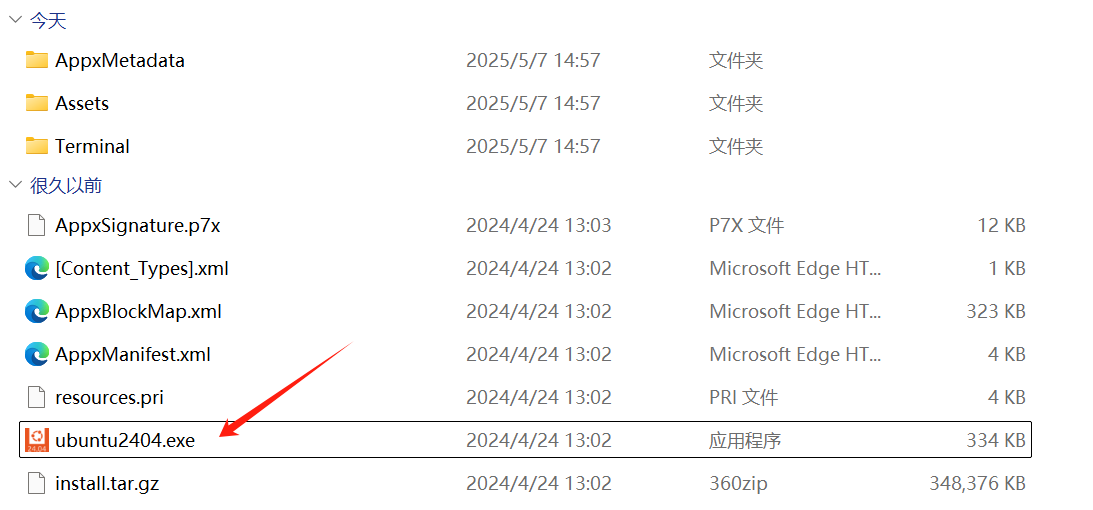 进入文件夹D:\Ubuntu_2404.0.5.0_x64,你会看到一个ubuntu2404.exe,直接双击即可