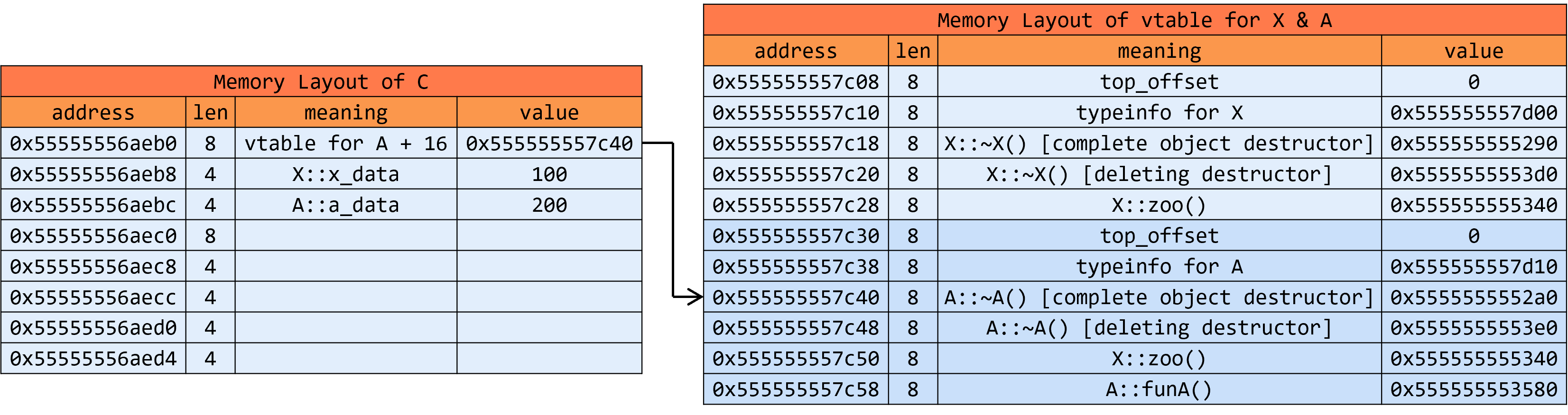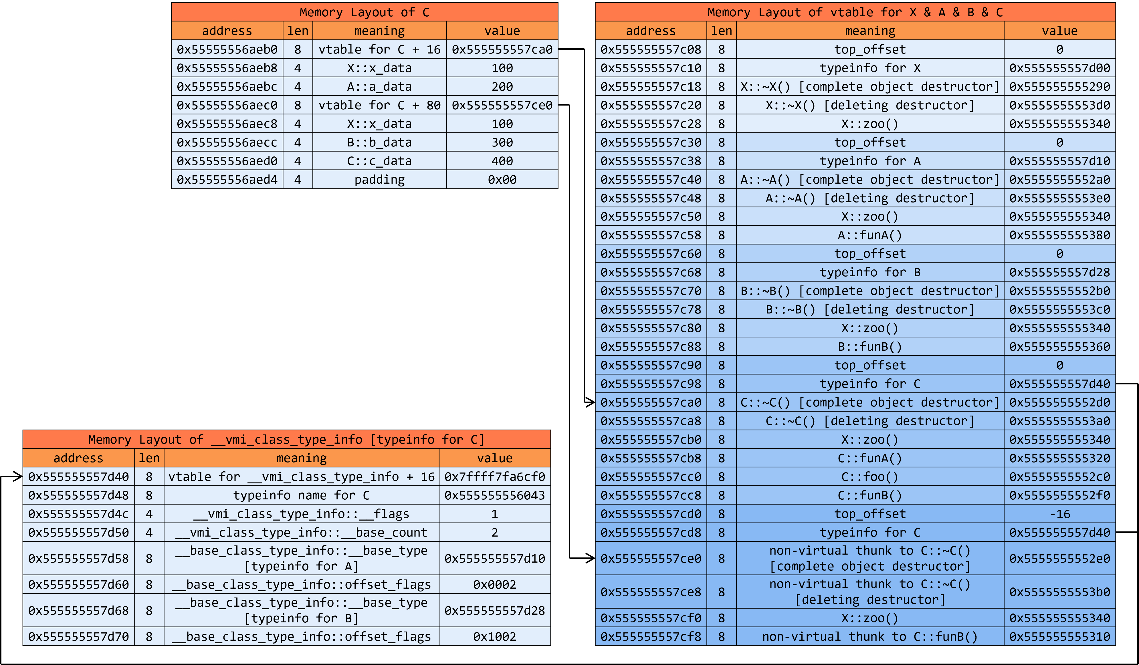 - 完整对象C的vtable的内存布局如下:首先是第一个直接基类A的虚函数表,其中typeinfo信息是C类的,并且,如果C类重写了A类某些虚函数,对应条目要换成C类版本的(比如这里的 C::funA() )。接着是C类自己的虚函数(比如这里的 C::foo() ),再接下来是C类重写的其它基类的虚函数,按声明顺序排列(比如这里的 C::funB() )。剩下的,就是其余各个基类的虚函数表,包括了top_offset、typeinfo(都指向C类typeinfo信息)、没有被override的虚函数、被override的虚函数(实际上是non-virtual thunk to的形式,后面详细介绍)等信息。