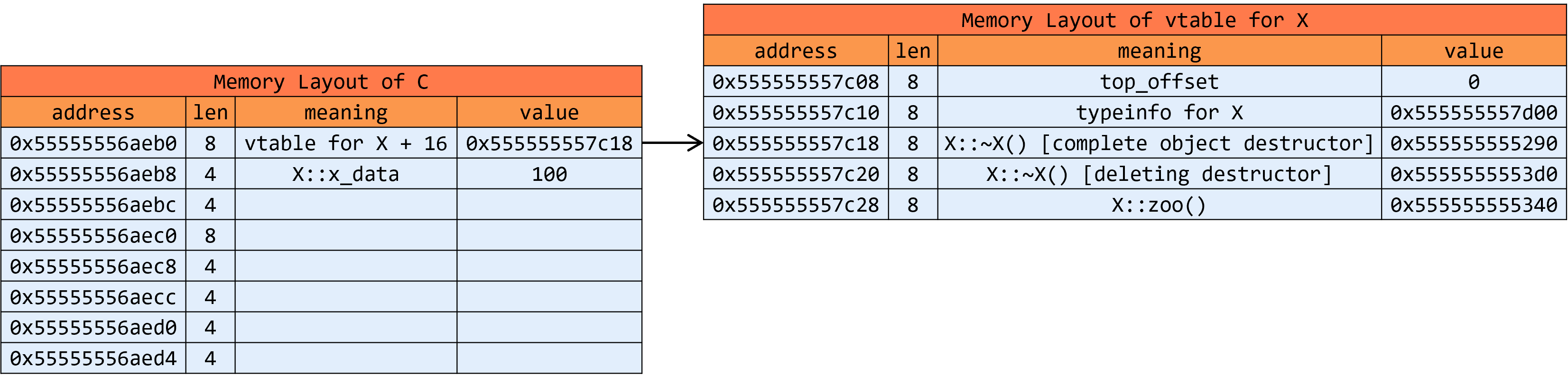 可以看到,在对象和vtable的内存布局上: