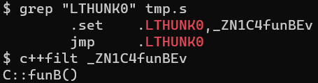 其中 .LTHUNK0 是 C::funcB() 的别名,可见,所谓的thunk函数,就是调整指针后再执行真正要执行的函数。