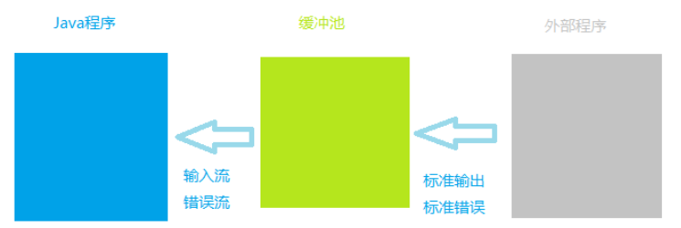 通过 Process实例.getInputStream() 和 Process实例.getErrorStream() 获取的输入流和错误信息流是缓冲池向当前Java程序提供的,而不是直接获取外部程序的标准输出流和标准错误流。