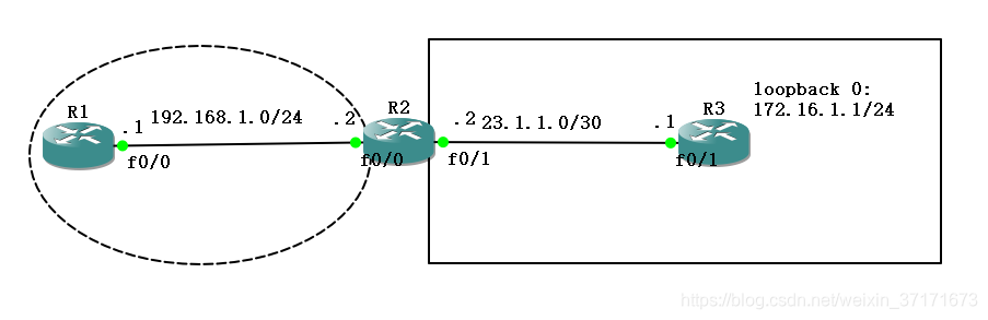4.在R3上配置一条默认路由指向R2,R2上配置一条默认路由指向R3;