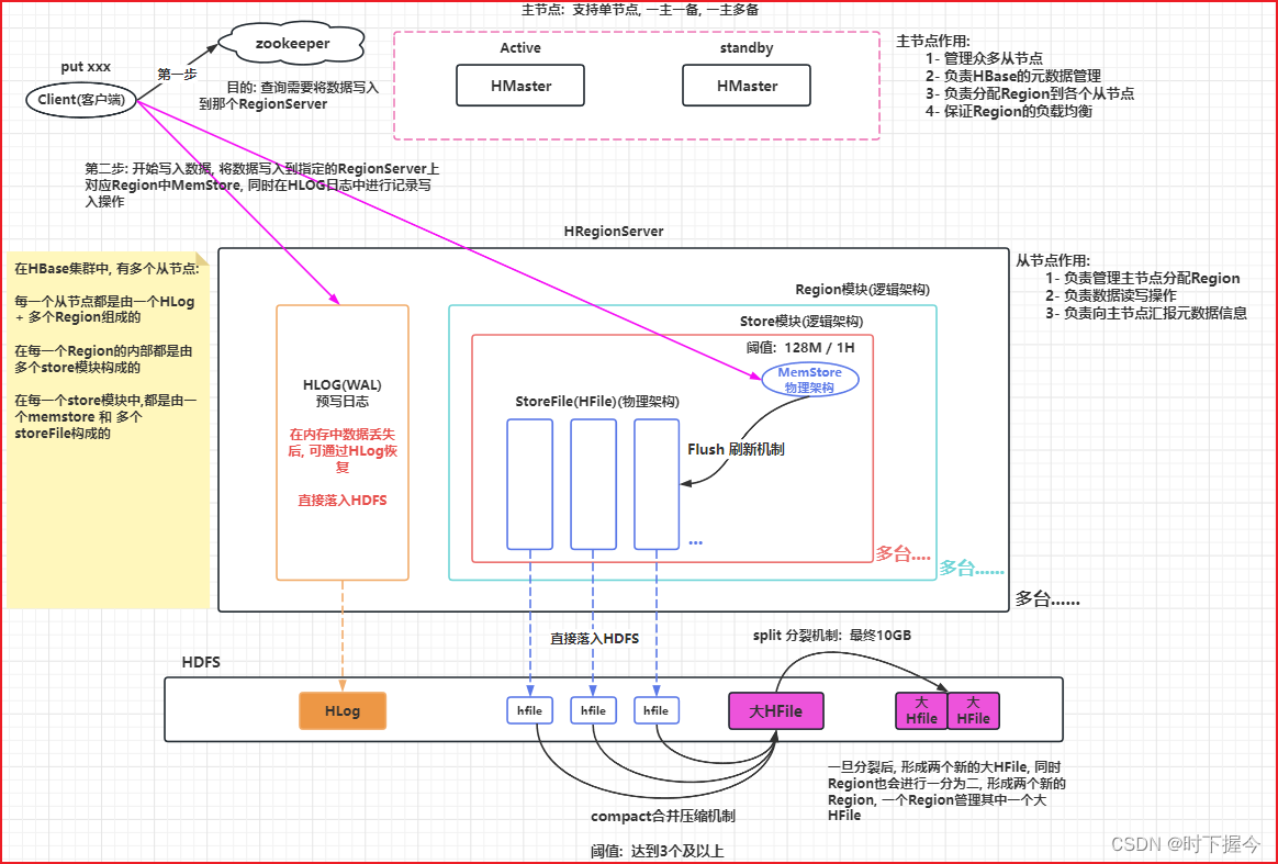 客户端读写HBase数据库的运行原理 ⑦ 随着不断的合并, HFile文件会越来越大,当这个大的HFile文件达到一定的阈值( “最终” 10GB)后,就会触发Split的分裂机制, 将大的HFile进行一分为二操作, 形成两个新的大HFile文件, 此时Region也会进行一分为二操作, 形成两个新的Region, 一个Region管理一个新的大HFile, 旧的大HFile和对应Region就会下线删除。一行数据的一个memstore触发溢写,该行数据的其它menstore也会同时触发溢写,增加了小文件的数量。