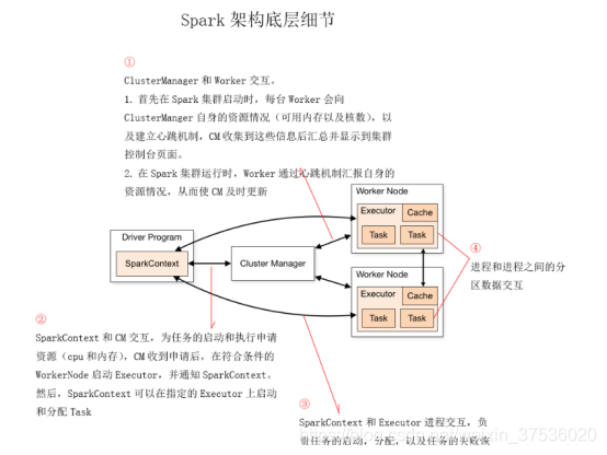 一个Spark程序的运行由Driver Program、SparkContext对象、WorkNode、Work进程、Executor执行器、Task任务和Cluster Manager集群管理器(Master结点)七个组件协同工作