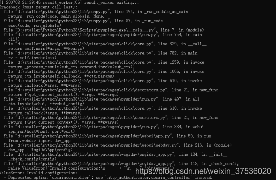 Pyspider的3.0及以上版本在安装时,会默认安装wsgidav的3.x版本,wsgidav的3.x版本目前仍然是测试版,相对于2.x更改了一些方法,所以pyspider all启动时,有上面的报错,针对这种情况。我们需要降低版本安装