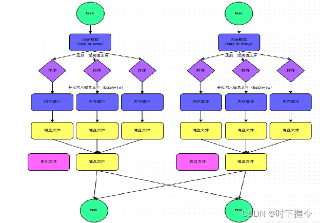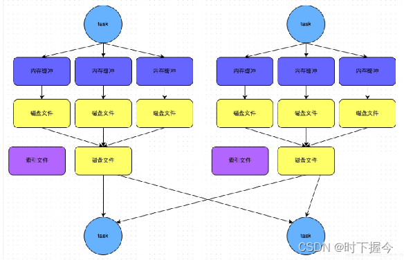 一个task就只对应一个磁盘文件,也就意味着该task为Reduce端的stage的task准备的数据都在这一个文件中,因此还会单独写一份索引文件,其中标识了下游各个task的数据在文件中的start offset与end offset。