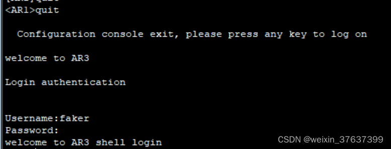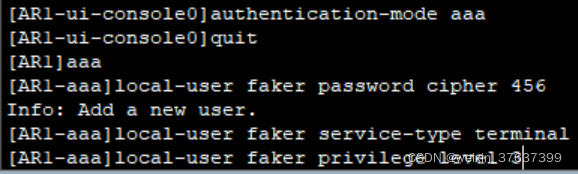 - 退出到系统视图下输入aaa后设置用户名faker和密码456后就新建了一个用户:[AR1-aaa]local-user faker password cipher 456