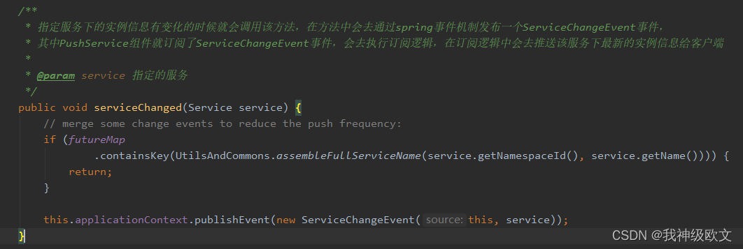 默认参数subcribe就是等于true,所以会使用getServiceInfo方法去获取到最新的服务实例,如果subcribe等于false,就使用getServiceInfoDirectlyFromServer方法每次都会请求服务器获取最新的服务实例。而getServiceInfo方法中获取到最新服务数据的是从serviceInfoMap这个内存map中获取到的,通过服务端推送数据实时更新这个内存map去保证每一次从这个map中获取到的服务实例都会是最新的。而如果使用了订阅拉取的方式进行服务方法,我们还可以去给指定的服务集群注册一个监听器,当服务器的服务信息发生变更推送数据给客户端的时候,这个监听器最终就能够被回调,从而就可以在监听器中获取这个服务集群最新的实例了