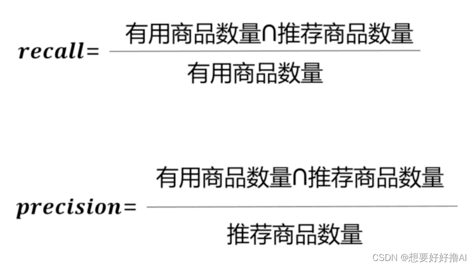 - recall值越大,推荐系统包含越多用户所需,目标是推荐的商品尽可能是用户所需