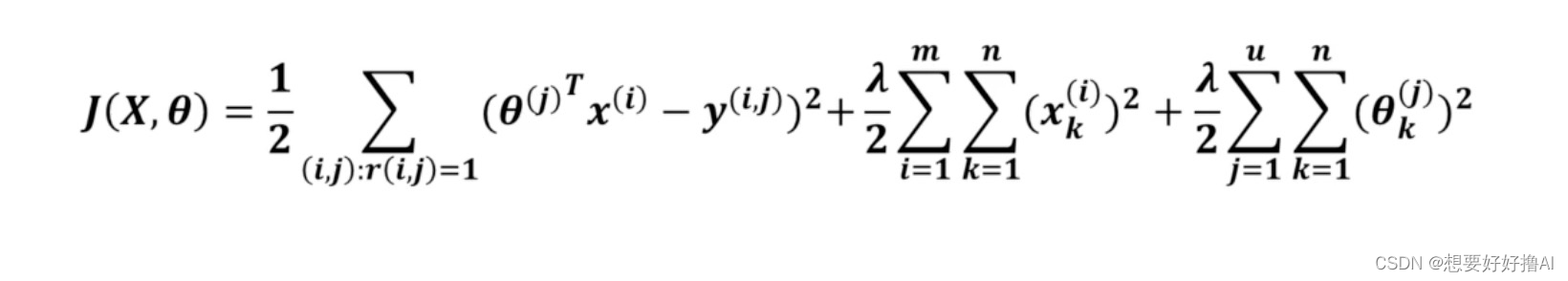 loss = 1/2 * tf.reduce_sum(((tf.matmul(X_parameters, Theta_parameters, transpose_b=True) - rating_norm) * record) ** 2) + 1/2 * (tf.reduce_sum(X_parameters ** 2) + tf.reduce_sum(Theta_parameters ** 2)) # 后面部分是正则化项,lambda为1,可以调整lambda来观察模型性能变化