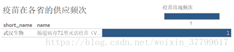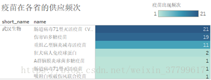 同时我们发现,武汉生物的肠道病毒71型灭活疫苗(Vero细胞)在各省的供应频次最高,达到21次,其次为伤寒Vi多糖疫苗(19次)和重组乙型脑炎减毒活疫苗(11次)。