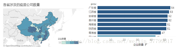 首先从地图上可以发现,广东省疫苗采购涉及的企业数量最多,达到54家,其次为江西(53家)、贵州(52家)、安徽(52家)、陕西(51家)、海南(51家),其余大部分省市涉及的企业数量都集中在40附近,而涉及数量较少的则是广西(11家)和甘肃(18家)。