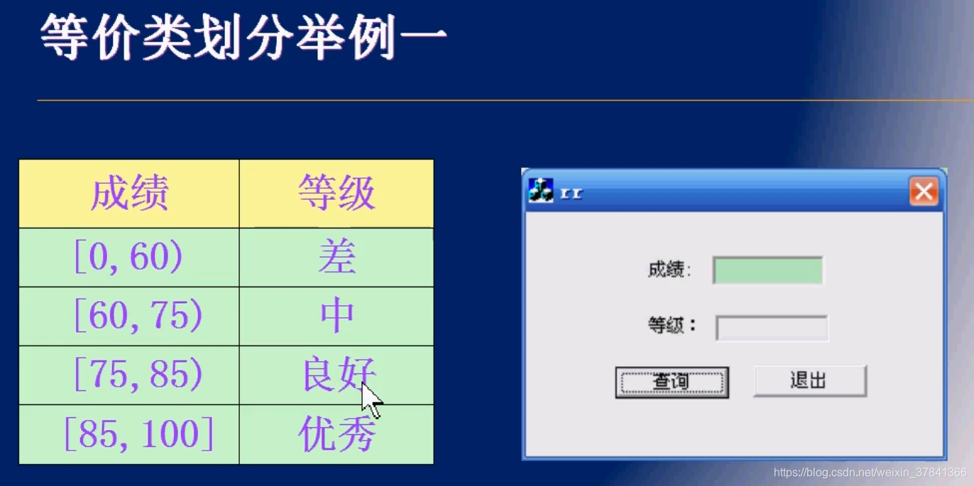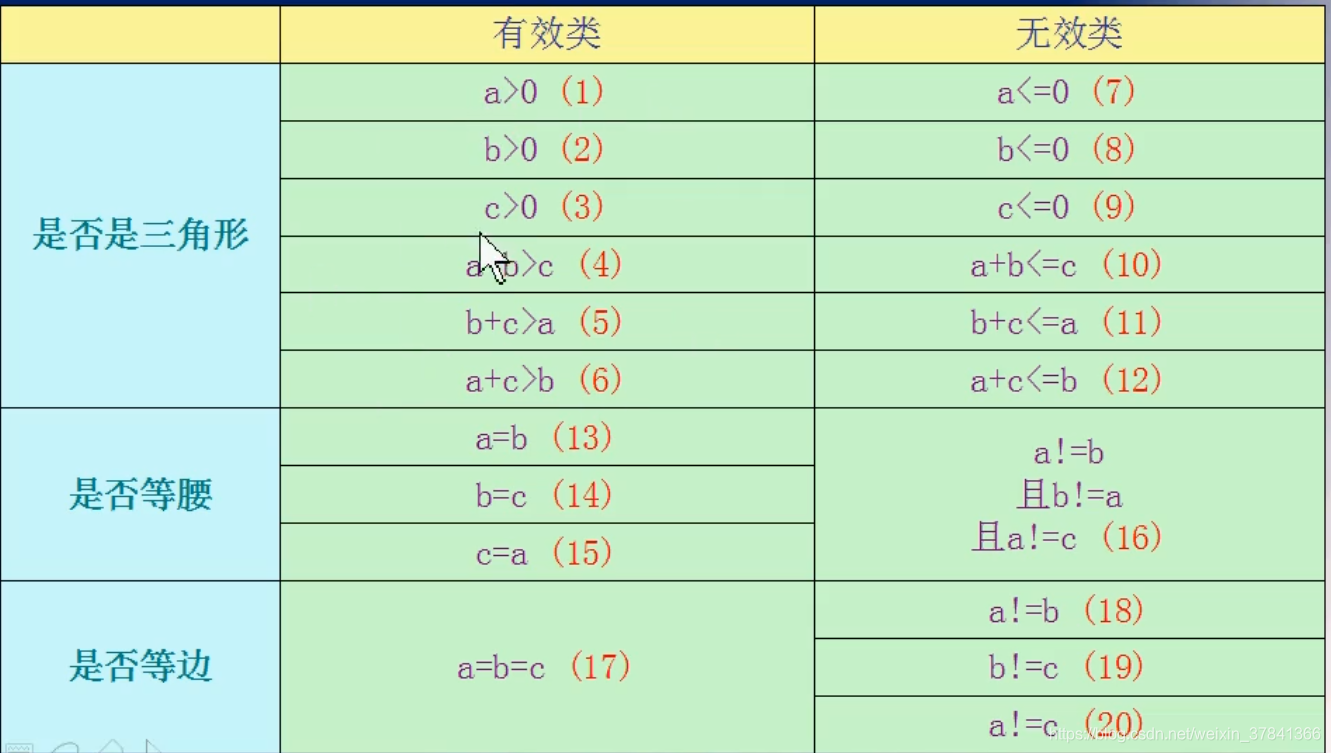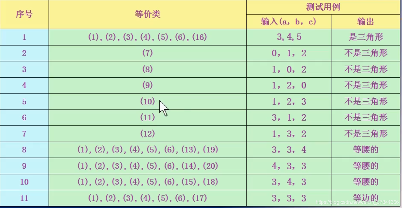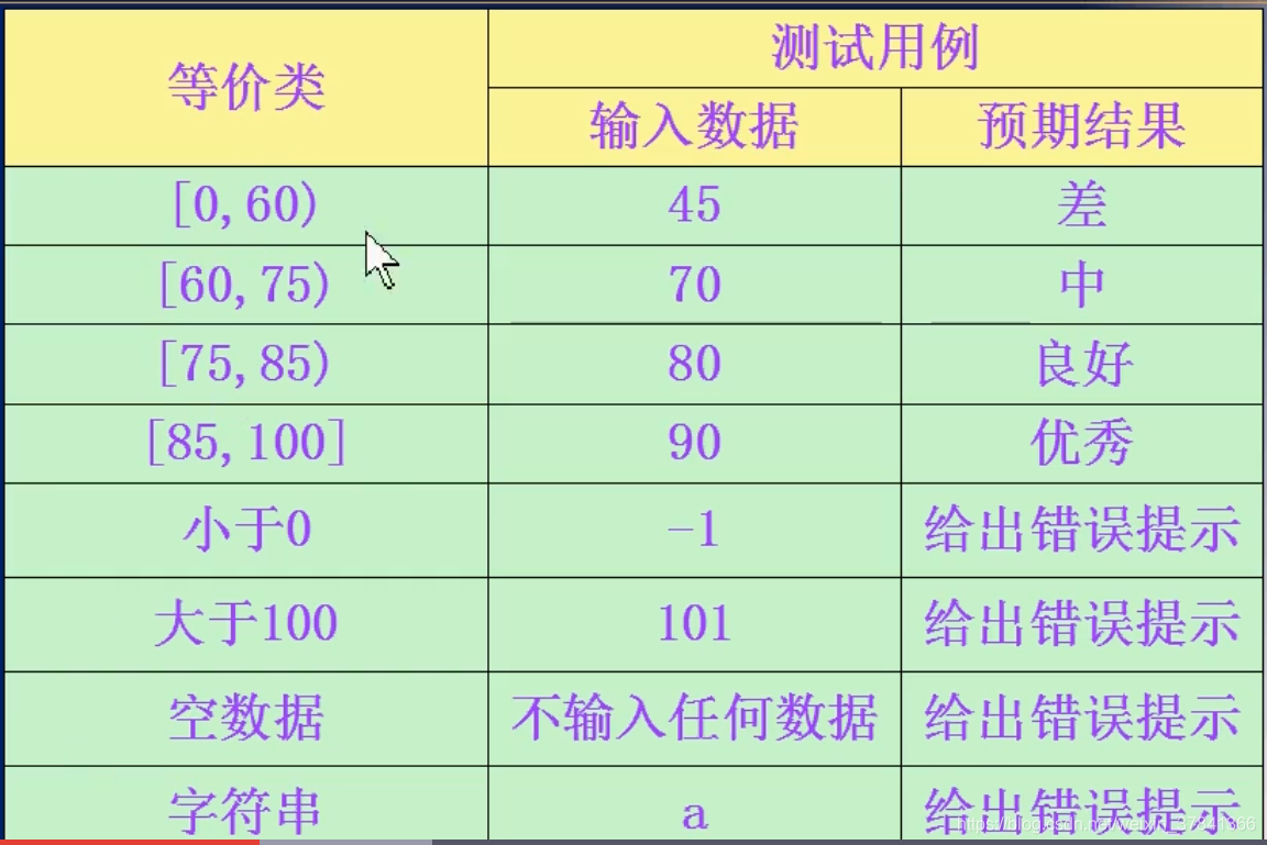 把程序的所有可能的输入数据划分为为若干子集,每一子集的代表性数据在测试中的作用等价于这一子集的其他值。每一个子集就是一个等价类。等价类需要考虑有效等价类和无效等价类