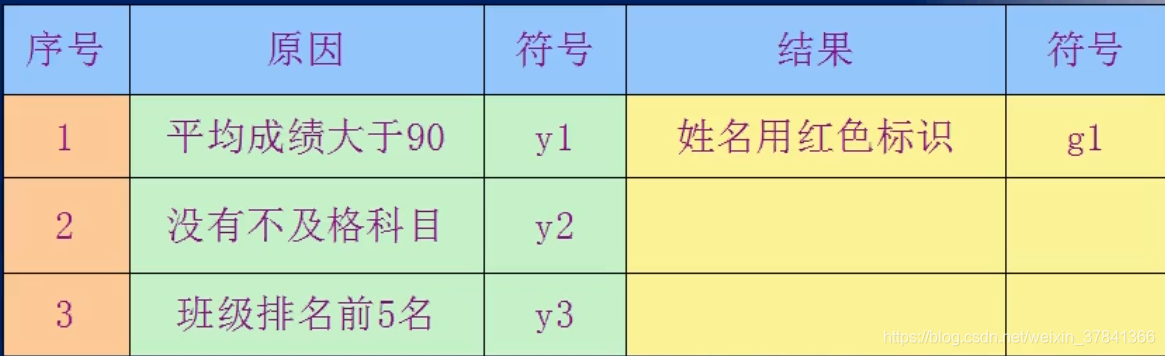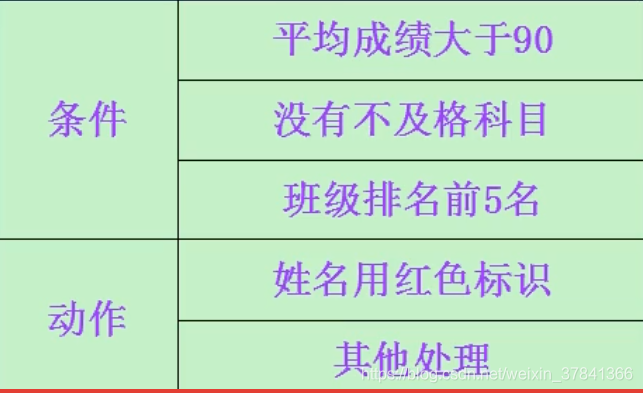 对平均成绩在90分以上,且没有不及格科目的学成,或班级成绩排名在前五位的学生,在程序中将学生的姓名用红色标识