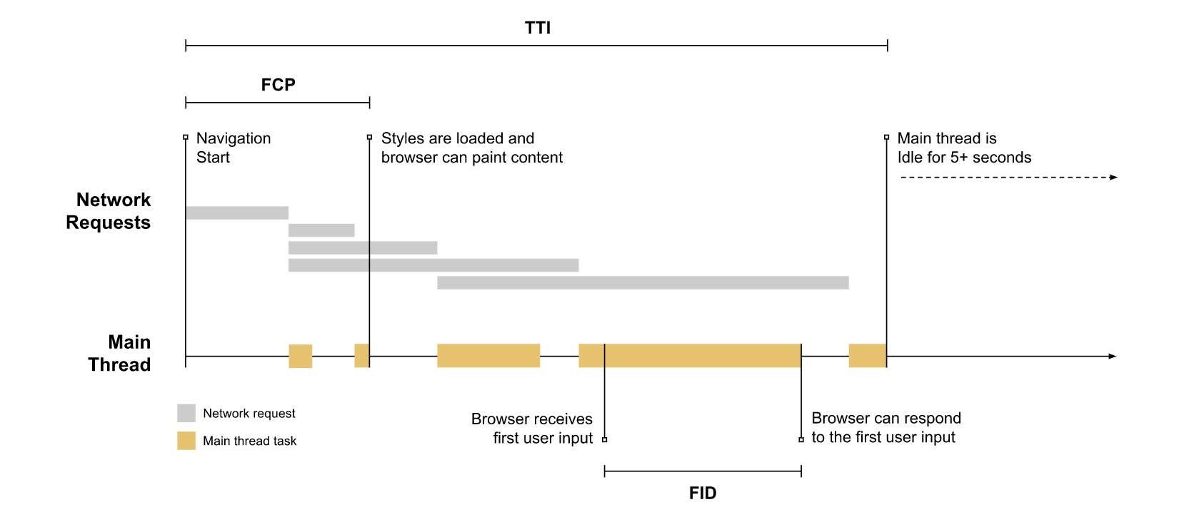 第一次输入延迟通常发生在第一次内容绘制(FCP)和可持续交互时间(TTI)之间,因为页面已经呈现了一些内容,但还不能可靠地交互。