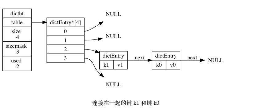 举例说明,如何通过next指针,将两个索引值相同的键k1和k0连接在一起: