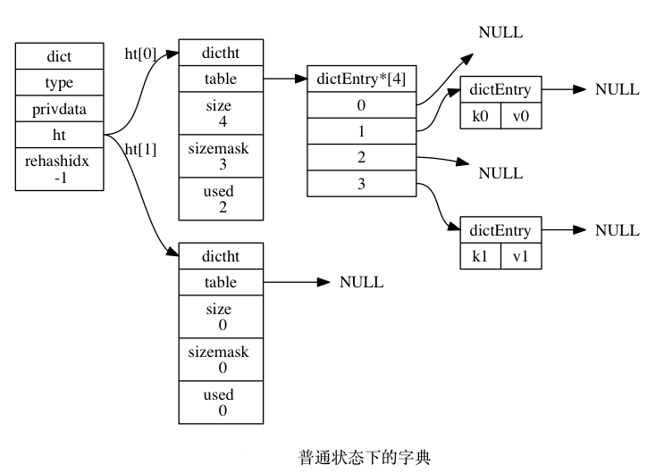 typedef struct dict { // 类型特定函数 dictType *type; // 私有数据 void *privdata; // 哈希表 dictht ht[2]; // rehash 索引 // 当 rehash 不在进行时,值为 -1 int rehashidx; /* rehashing not in progress if rehashidx == -1 */ } dict;