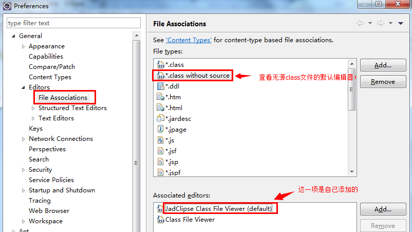 4、此时,打开Eclipse->Window->Preferences->General->Editors->File Associations,可以看到如下图;