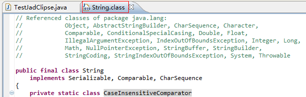 通过选中main函数的参数类型String,点击F3,即可显示出String.class文件,该文件是通过JadClipse插件反编译产生。