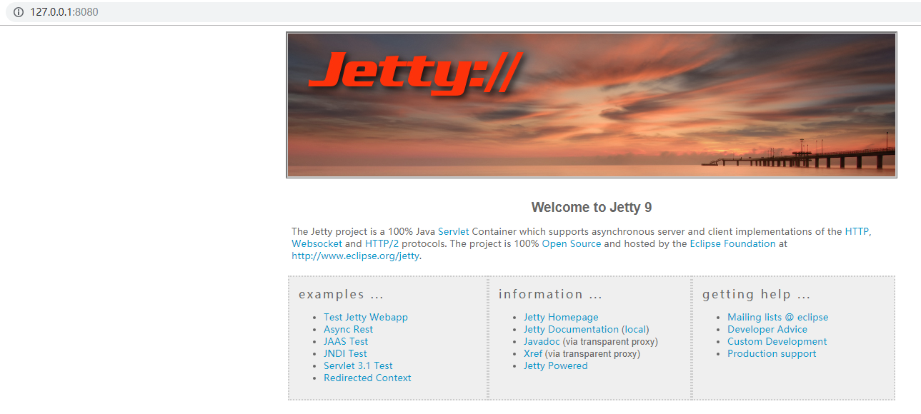 打开浏览器,访问http://127.0.0.1:8080,此时可以看到Jetty的欢迎页面了。