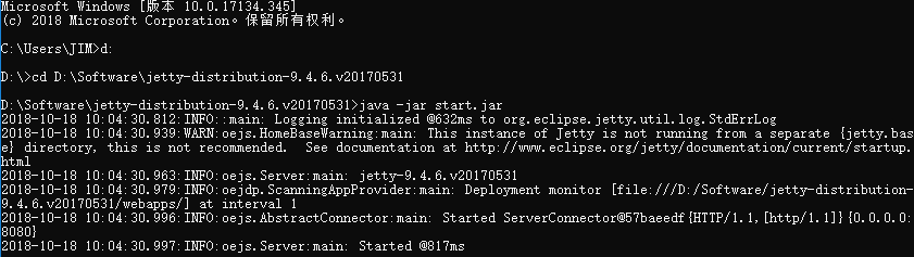 1. 运行 cmd 命令进入 dos 环境,并进入 jetty 安装目录下: