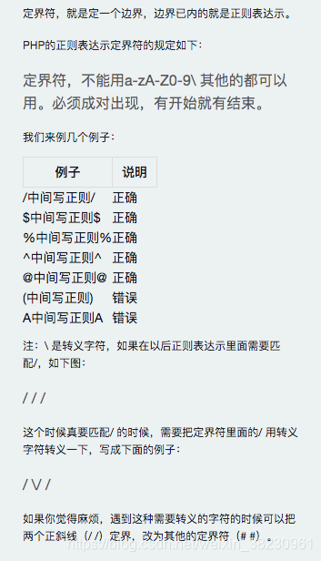 头尾两个斜杠/是正则表达式的定界符,这是Perl正则的标准,而PHP支持的正则表达式就是Perl正则的规范。表示两个斜杠之间就是正则内容。定界符可以自定义,比如用@、#都可以,定界符外面可以写参数,比如i、u、U等