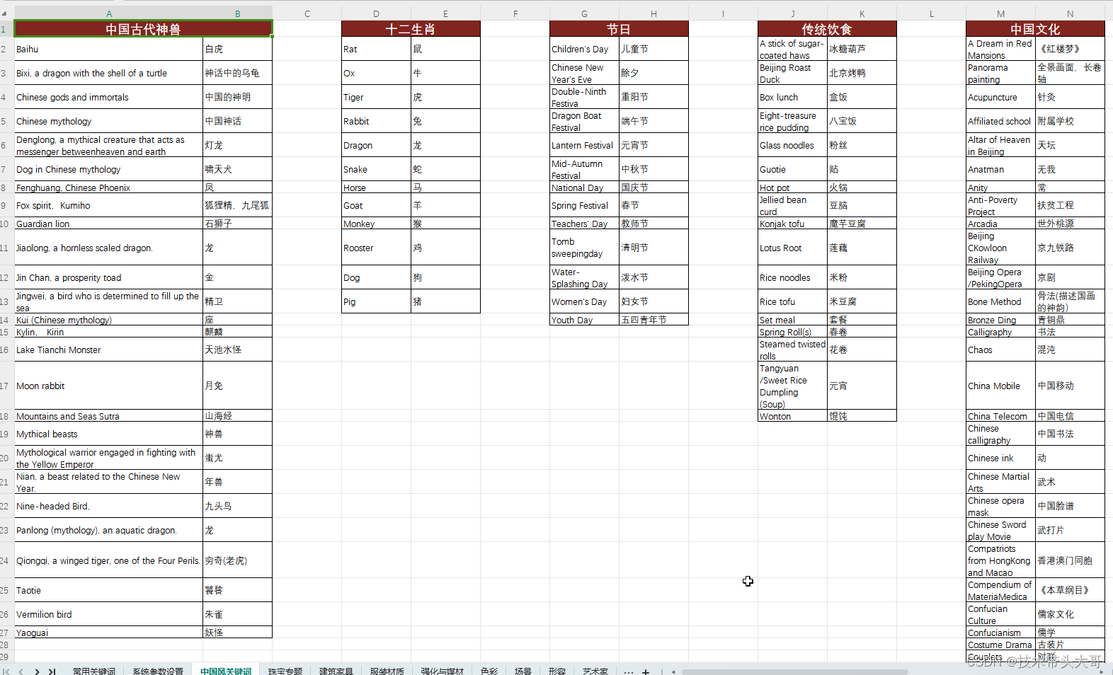 中国风关键词:中国古代神兽、十二生肖、节日、传统饮食、中国文化