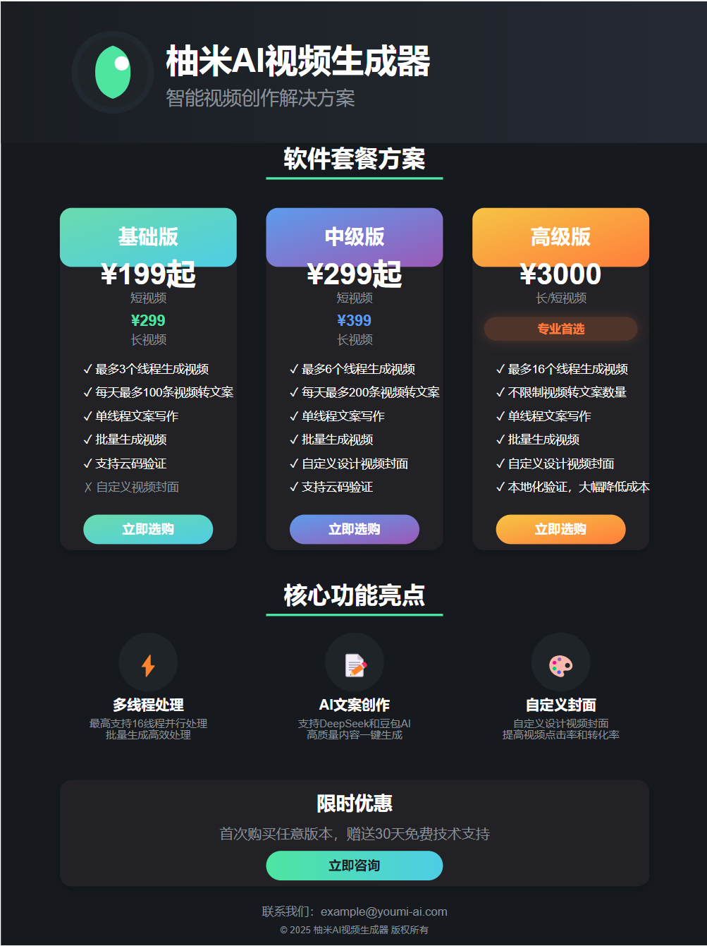 现在批量生成软件已经制作完成了。我需要设计一份价格海报图。软件名字叫柚米AI视频。要求设计的图专业,美观,大方。和视频类软件风格相似。注意使用SVG格式输出海报内容即可。